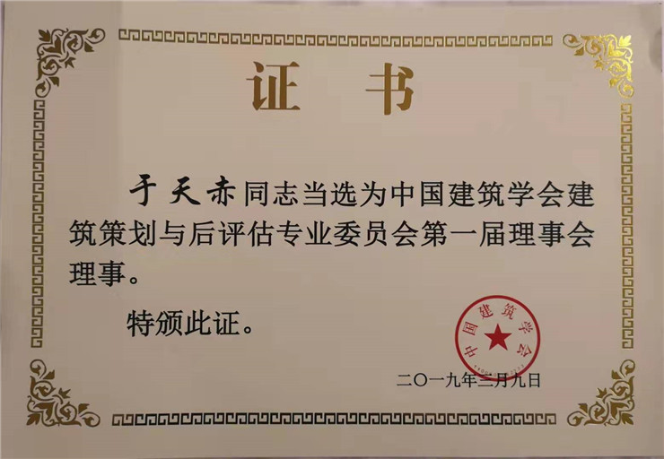 2019年3月成立的中國建筑學會建筑策劃與后評估專業委員會,由清華大學牽頭,建學建筑與工程設計所有限公司為理事單位。于天赤總建筑師代表建學擔任第一屆理事會理事。