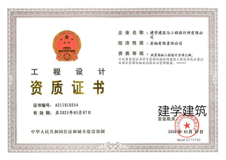 近日,公司順利獲得風景園林工程設計專項乙級證書。 此次資質申請工作的順利完成,使公司的企業資質得到了進一步的鞏固和提升。新資質的取得,將使公司在相關領域得到進一步擴展,業務范圍得到進一步延伸,為公司的發展奠定了更為堅實的基礎。