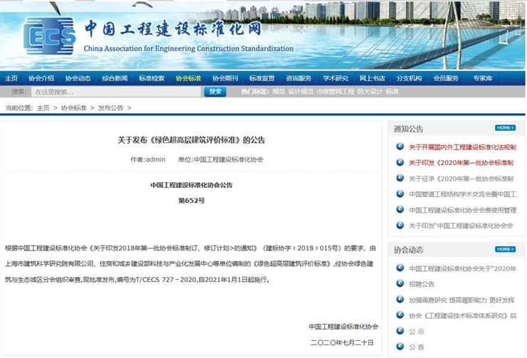我司參編的《綠色超高層建筑評價標準》(T/CECS 727-2020)通過中國工程建設標準化協會綠色建筑與生態城區分會審查,已于2020年7月20日發布,將于2021年1月1日起開始施行。