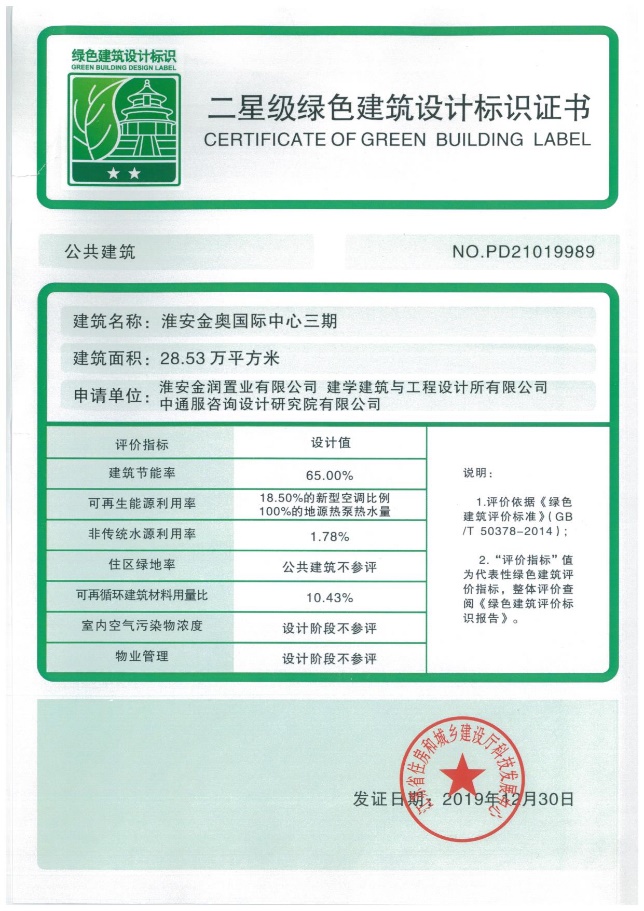 由我司設計的淮安金奧國際中心三期綜合體獲二星級綠色建筑設計標識證書。