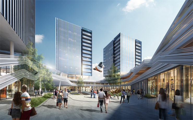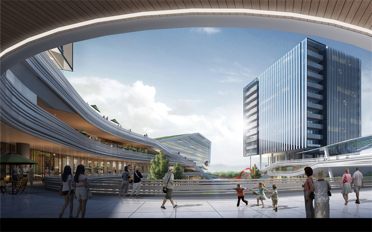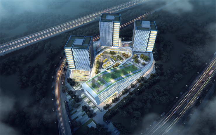 該項目的設計理念:以依靠設計創新的力量,創造一個豐富多元的公共空間將不同類型和規模的企業和各種各樣的人群連接到一起。利用裙房從地面抬起,形成弧坡,將裙房比作基石,再起高樓。由于塔樓是完全架在裙房上,從視覺它就比周邊的樓房立足點高,在整個區塊上就會凸顯。同時在裙房與塔樓之間架空,結合景觀做一個空中花園。白天它是一個園區一個辦公場所,晚上它就是一個吸引周邊居民匯聚的活動場所。增加街區的生活氣息才能讓一個辦公園區更加的活力化。