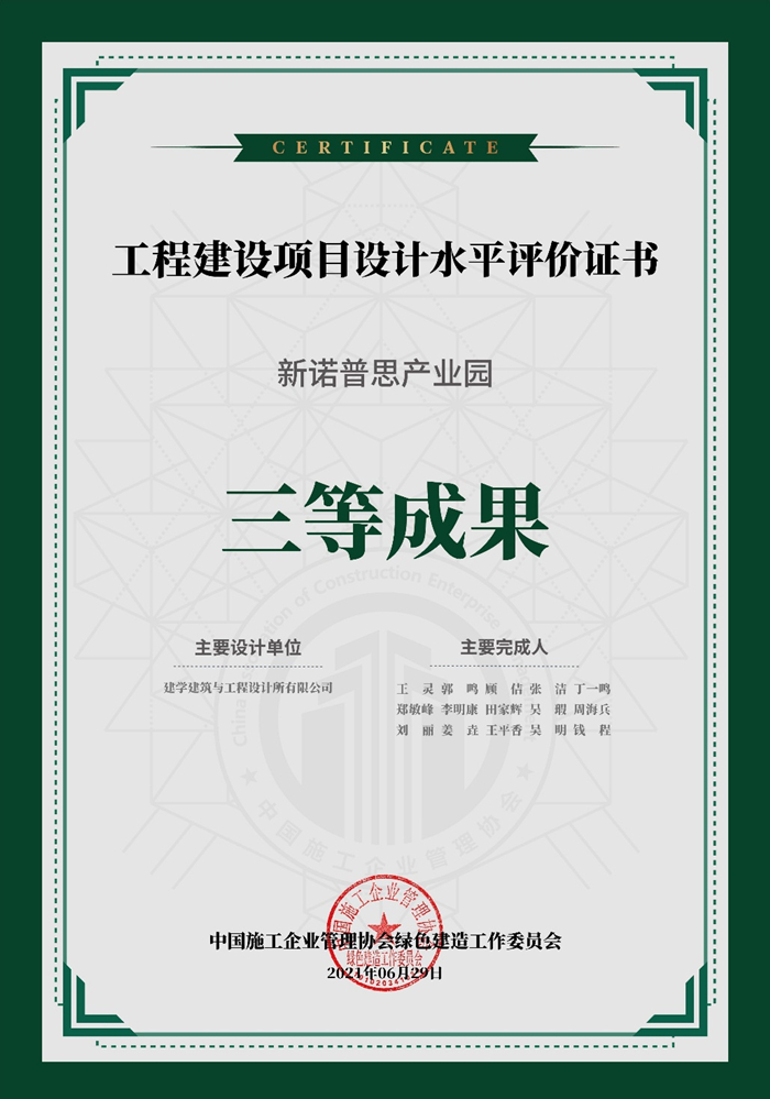 由我司設計的新諾普斯產業園獲得中國施工企業管理協會綠色建造工作委員會頒發的工程建設項目設計水平評價三等成果證書。