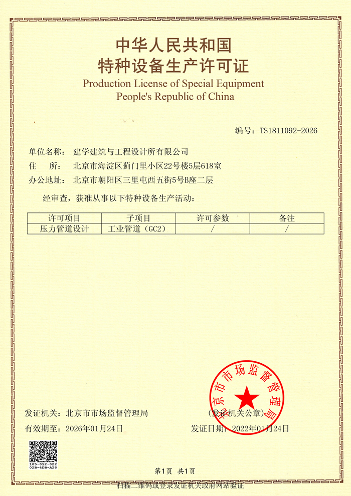 熱烈祝賀建學建筑與工程設計所有限公司榮獲《中華人民共和國特種設備生產許可證-壓力管道設計-工業管道(GC2)》資質證書。