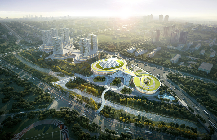 建筑采用山、水、魚、石的概念,在山水中散落,寓意“大珠小珠落玉盤”,承連平自然之華新舊銜接,開連平未來之門;景觀突出“綠色與活力”的主題,以曲線作為構圖元素,豐富植物層次,維護河道生態穩定;可持續設計方面采用零碳排、零水耗、零感知的設計理念和綠島取代熱島的綠色設計措施應用,項目將成為廣東省首個超低能耗文體中心。