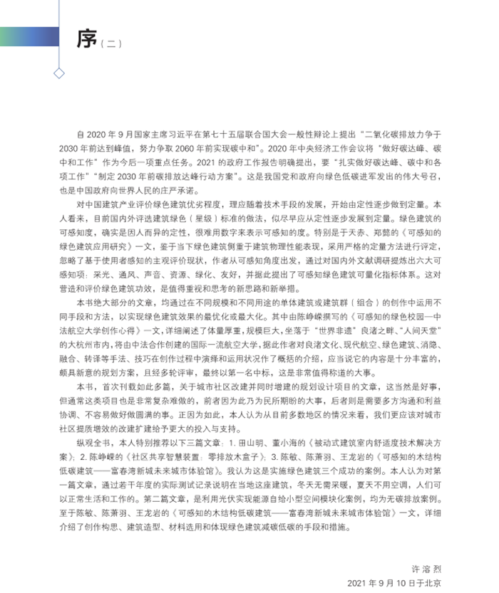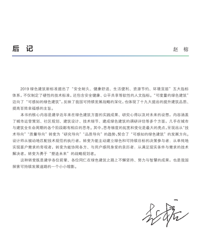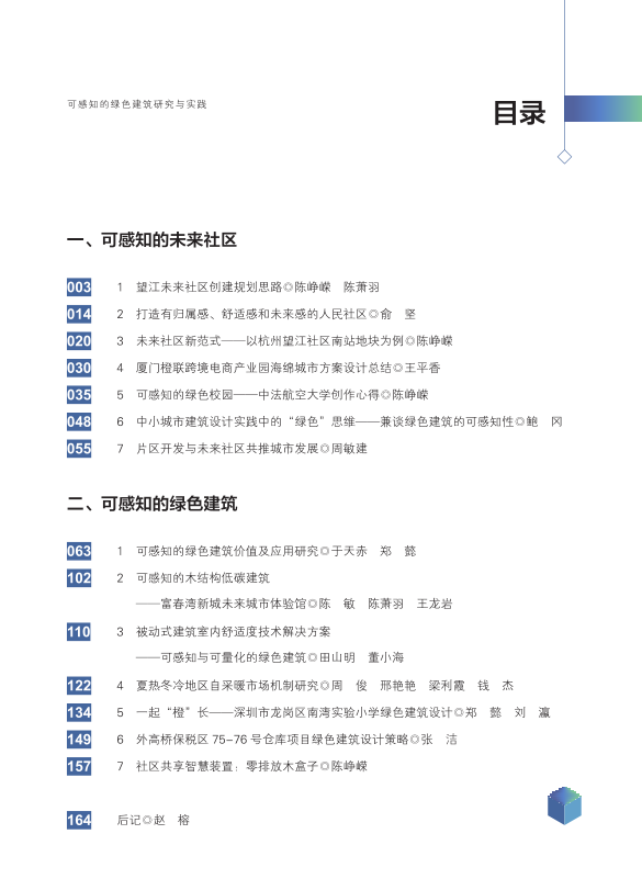全書分為兩篇,分別為可感知的未來社區和可感知的綠色建筑。共收錄14篇文章。其中,許溶烈院士作序,一級注冊建筑師、建學杭州分公司主持建筑師趙榕撰寫后記。 本書最大的亮點在于對綠色建筑的思考維度的拓寬和變化,呈現出從“技術導向”“質量導向”轉變為“研究導向”“品質導向”的趨勢,設計師從被動地匹配技術規范的執行者,轉變為能主動建立綠色和可持續目標的決策參與者;從單純地實現客戶需求的旁觀者,轉變為能協同各方、與用戶感同身受的親歷者;從滿足現實條件與需求的技術解決者,轉變為勇于“塑造未來”的戰略規劃者。