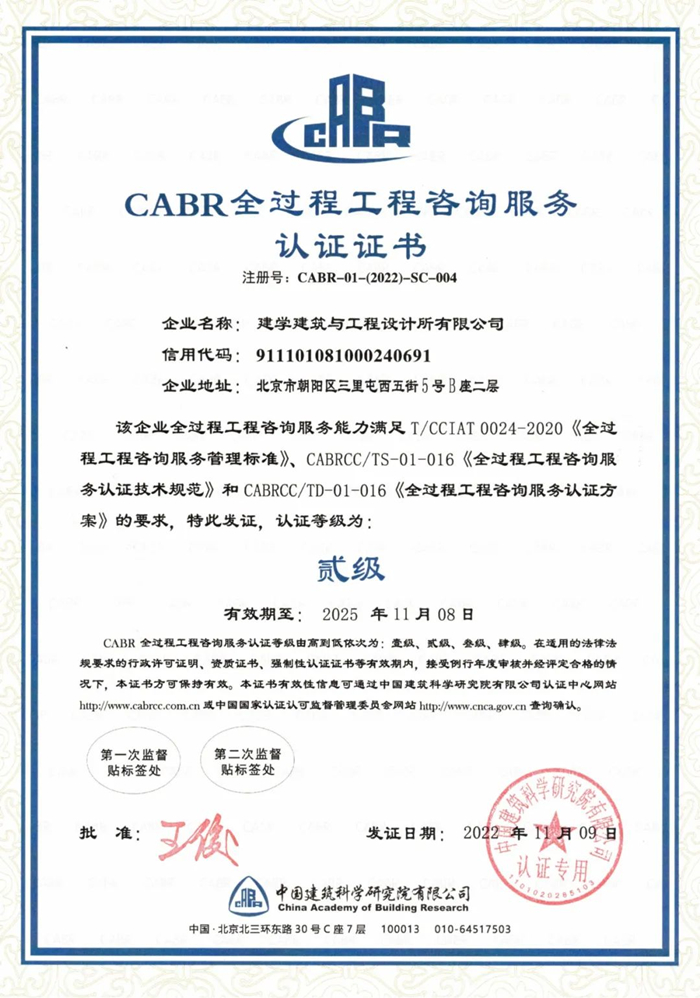 2022年11月9日, 中國建研院認證中心為建學建筑與工程設計所有限公司(以下簡稱“建學建筑與工程設計所”)頒發了CABR全過程工程咨詢服務認證證書。