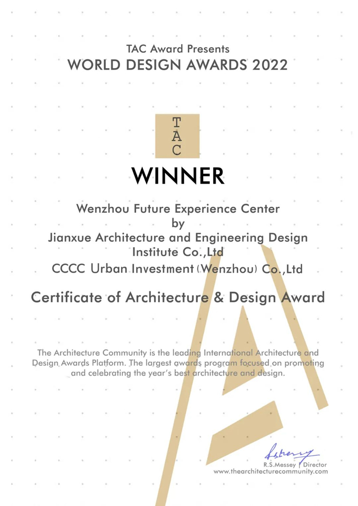 近日,由中交城投(溫州)有限公司全力打造的溫州未來體驗館成功獲得2022年世界設計獎(World Design Awards)