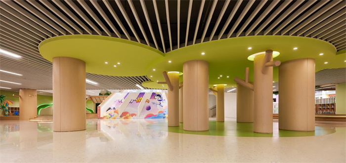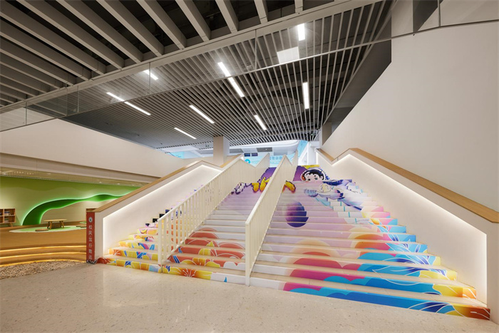 主入口的設計借鑒傳統客家建筑入口形式以及廣東嶺南園林的造園手法,采用圓拱型設計,通過與建筑外立面的方與圓的對比強調入口形象,增強進入校園的儀式感。入口室內裝飾設計采用時光隧道的概念,體現學生由家進入校園后氛圍和心情的轉變的過程隧道,學生通過光暈的隧道,調節內部心理,通過隧道后進入學習的海洋。利用時光隧道明顯的分隔校內校外空間,讓學生感覺到進入另外一個世界,增強學生的學習興趣。