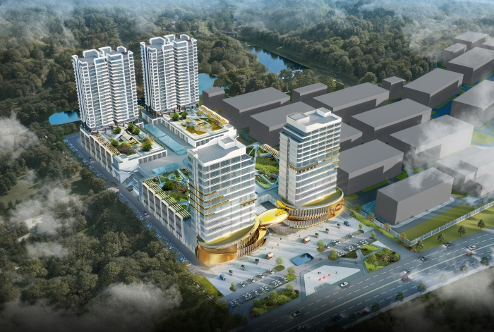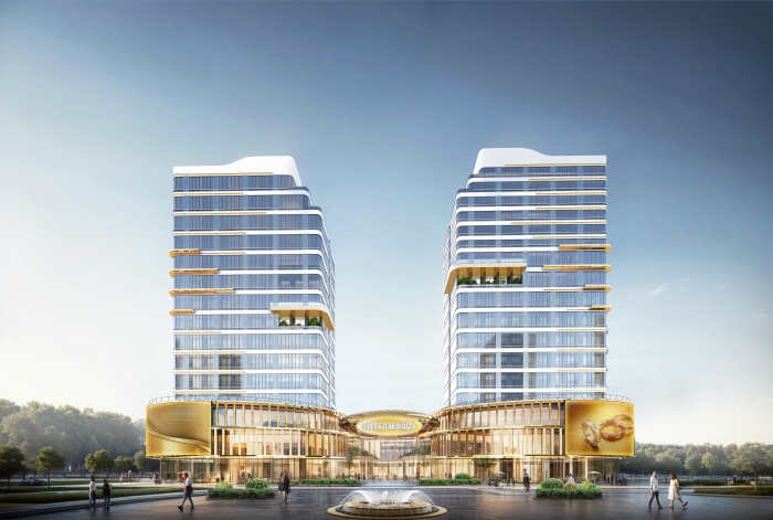 本項目在用地內擬布置4棟塔樓,3層裙樓。塔樓分別設置辦公公寓、酒店、商務公寓等功能建筑,打造完整、便利的產業鏈配套基礎設施及服務;建筑造型設計上結合珠寶首飾的特點,以“金珠落金盤”的設計理念創造璀璨的建筑形象。