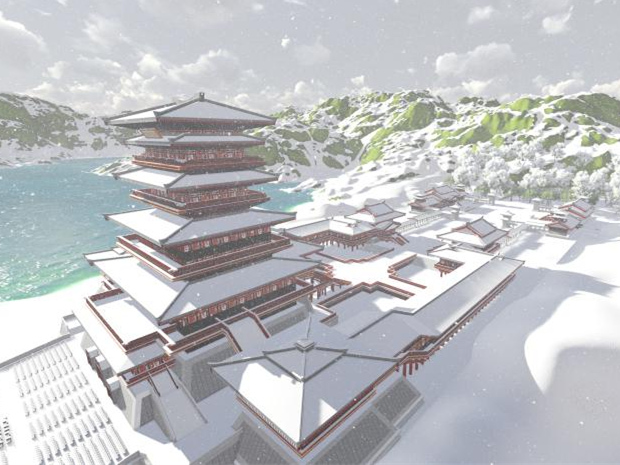 總體建筑群南北占地135 米,東西100 米,總面積14300 平米。主閣通高60 米,內部九層,呼應九仞,臺高兩層,樓閣七層,四明三暗五滴水。副閣通高20 米,內部三層,臺高兩層,閣高一層。三閣連以飛梁,姿態磅礴中不失飛揚,足當文史全園之領袖,足張司馬追風之宏旨。