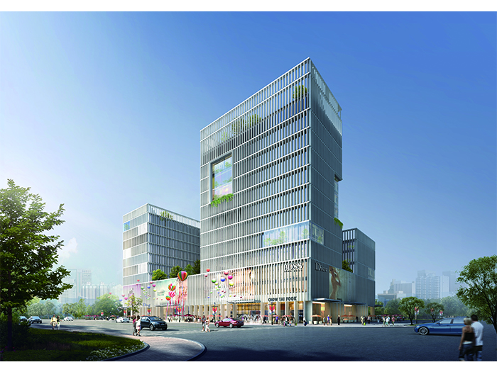三層商業裙房在兩個高層建筑圍合下,在基底內部以水平方式展開。