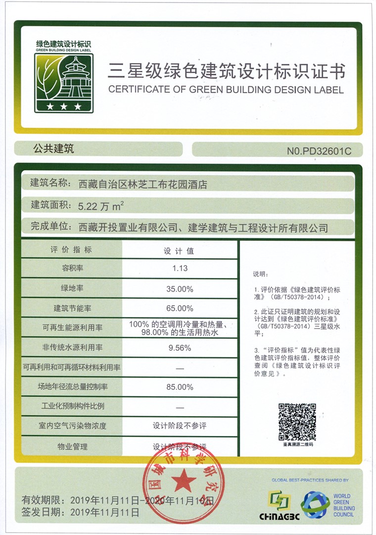 西藏自治區(qū)林芝工布花園酒店取得三星級綠色建筑設計標識證書 |