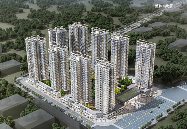 住宅建筑呈展開布局,沿用地邊線布置9棟高層住宅,首層商業網點同時設計大型中央花園,花園內布置公共架空層及物管用房等配套設施。