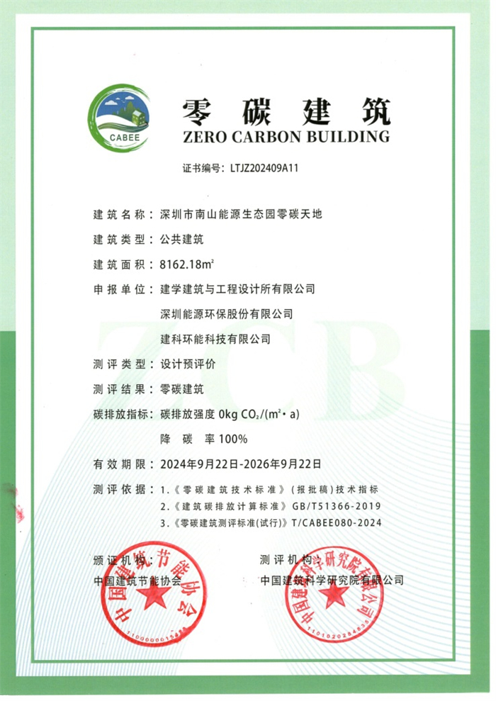 9月22日,深圳市南山能源生態園零碳天地項目獲得中國建筑節能協會頒發的零碳建筑認證證書。