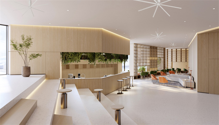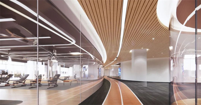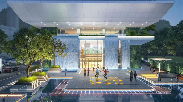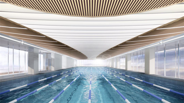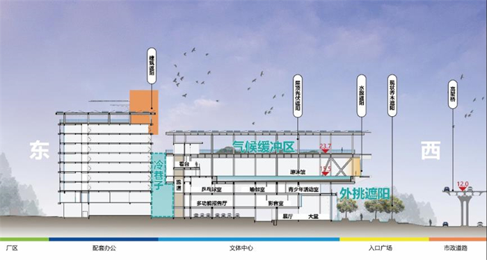 1. 適應氣候 (01)“腔層"設計: 針對深圳地區“濕、熱、悶”的氣候特征,以及場地環境噪音干擾較大的情況,在建筑的南側、北側設置交通空間與屋頂光伏的氣候緩沖層,共同組成一個隔熱的“腔層”空間,提高了使用空間的隔熱、防噪性能。 (02)水膜隔熱: 在首層大堂外和四層游泳館西側玻璃上,采用了0.5cm的水膜,經過設計模擬,降低了玻璃外表面的溫度,從而減少游泳館空調負荷。