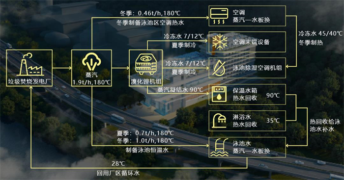 2.因地制宜 深圳市南山能源生態園每日可以處理南山區全部生活垃圾,對于改善城市環境、減少城市碳排放起到重大作用。垃圾焚燒后產生的熱及爐渣,使用循環水進行冷卻,將電廠的“三廢”(廢汽、廢水、廢渣)高效地再利用,是本項目重要的技術創新。 (1) 高溫蒸汽發電后的“廢汽”,在本項目中得到高效再利用。從垃圾電廠引入1.9t/h、低溫蒸汽,在項目多場景的余熱梯級利用如下:● 用于溴化鋰空調制冷與除濕;● 用于泳池水恒溫加熱;● 用于冬季泳池空間供暖等。電廠余熱梯級利用,蒸汽年總利用量為1042t/a。