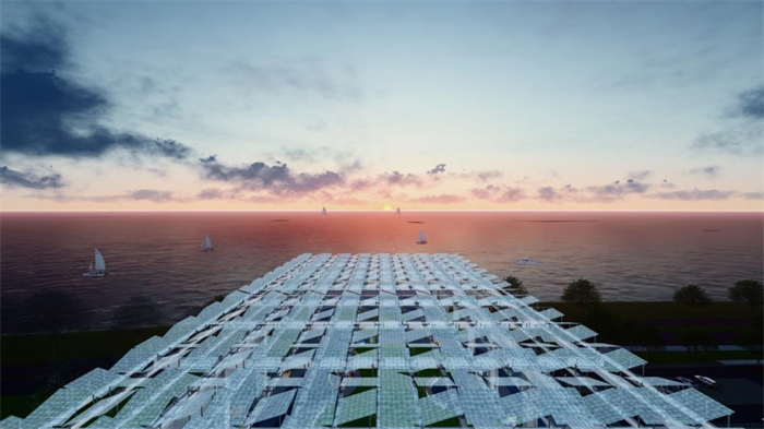 3.光建一體 利用深圳地區太陽高度角較高的特點,將屋頂光伏設計成東、西、南、北方向以8°傾角鋪設的藝術造型,營造一幅“海邊波光”浪漫的圖畫,與大海連為一體,構成了低碳建筑的“新美學”。