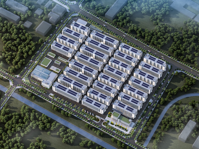 本項(xiàng)目整個(gè)園區(qū)細(xì)化布置生產(chǎn)區(qū)、環(huán)保服務(wù)區(qū)、動(dòng)力區(qū)、倉儲(chǔ)區(qū)、綜合服務(wù)區(qū)5大功能區(qū),通過南北向主線及東西向發(fā)展次軸,圍繞環(huán)保服務(wù)區(qū)拓展,布置14棟表面處理廠房、1棟綜合服務(wù)大樓、1棟綜合站房、3棟倉庫、1棟廢水處理中心及守衛(wèi)室、初期雨水收集池、圍墻、架空管廊、槽罐區(qū)、35kV變電站等配套附屬構(gòu)筑物,形成完整的表面處理功能鏈和互動(dòng)關(guān)系。