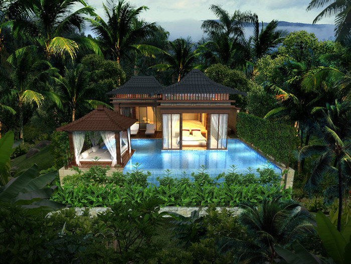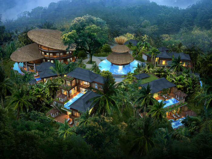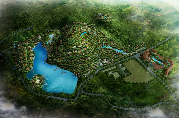 項目用地總規模約339畝,容積率0.46-0.47,建筑總面積約115000平米(地上約9.5萬平米,地下約2萬平米),其中酒店、會所等酒店公共建筑總建筑面積約27400平米;別墅及類別墅客房總建筑面積約70550平米;洋房及公寓類客房總建筑面積約15300平米。體建筑風格為東南亞風格,別墅多為一層建筑,大戶型別墅除外;酒店公建及公寓為1-4層建筑。