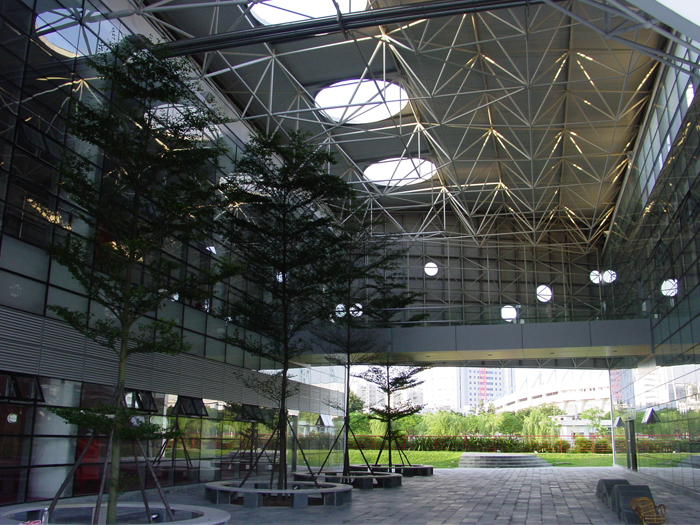 基地原為一處休閑綠地,擁有360°景觀,無主次之分。在設計中抓取水珠在綠葉上流動的舜時形態,做為創意的原形。非線型柔和的建筑形態可以緩和外部的沖擊,給人以視覺上的平和感。建筑中部分架空形成的休閑空間即是各種入口的前廳,又是市民納涼休閑之地。圓洞窗、白涂料、青石板、欖仁樹,這些非建筑的語言、“低檔”的材料,質樸、自然。設計之道在于自然。