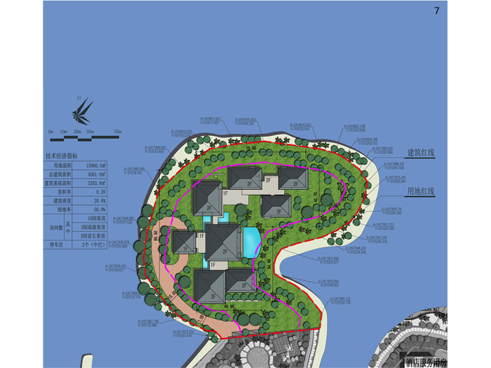 結合島上的地形情況,將建筑伸展開來。形成廣場、公共部、過渡部分、私密部分,分工明確,互不干擾又便于使用。重要的高級套房和豪華套房設置在二樓,既保證安全性,又便于管理。