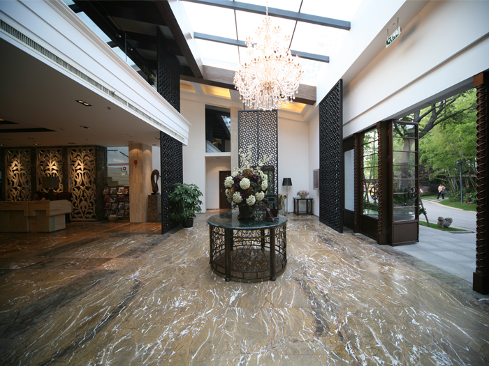 鐘山美廬利用周邊及場地內的景觀資源,依山而居,規劃為坡地山莊。以組團式布局作為組織方式,通過環形主路將各組團串聯,構成一個有機整體,形成由小區內干道半私密半公共的組團綠地,各戶私家宅院的有序的空間層次,使建筑與環境融為一體,寓建筑于風景中。在用地的北部沿金馬路設置小區入口,通過濃密森林景觀氛圍,強調入口山地別墅的意向,入口兩側為會所,使別墅主人體驗非同一般的儀式感與尊貴感。用地中部由四條溪流蜿蜒其間,讓山體的泉水和綠色沿小溪流入別墅社區,成為塑造小區景觀的四條軸線,同時也將環形主路內的用地自然劃分為五個相對獨立又親水的半島組團;用地東側緊鄰小龍山部分則布置大戶型別墅,充分享受山體景觀;南側面是小龍山蜿蜒的余脈,與小龍山一起如一把交椅坐擁小區;用地西北側布置為雙拼,收攏小區邊界,使整個區域藏風聚氣。