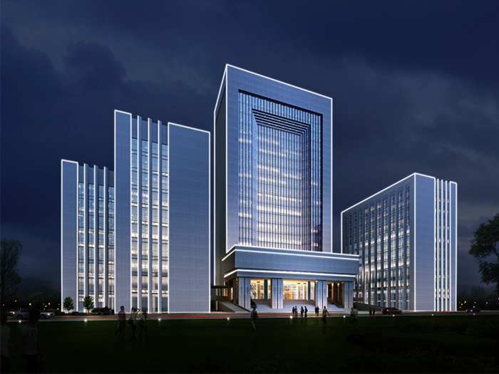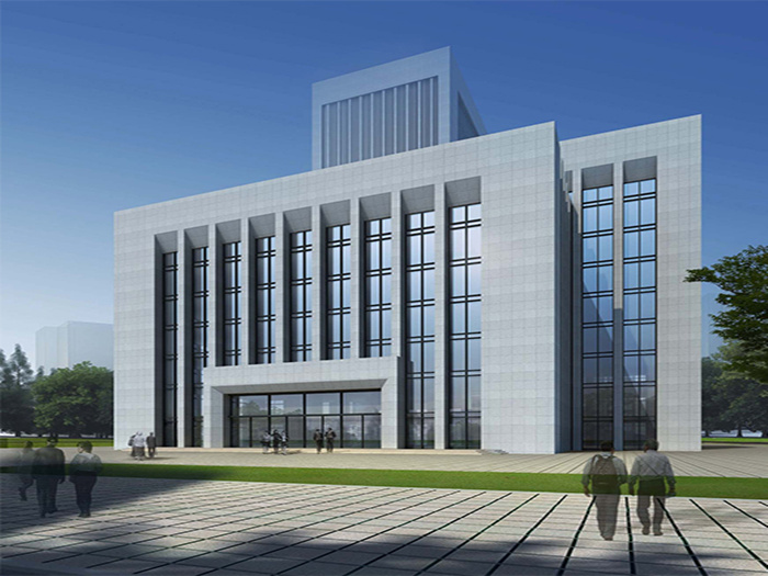 立面處理虛實結合,虛-- 結合豎條設置玻璃幕墻,賦予建筑現(xiàn)代氣質(zhì),實-- 以淺色花崗石為表皮肌理,結合整體視覺比例,局部加寬,增強建筑厚重感、穩(wěn)重感。