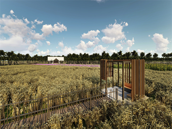 在這次設計中路演中心建筑是由混凝土和織物形成的雙層表皮,擁有獨特的視覺效果和良好的寓意,其中清水混凝土代表著最樸實、最原初的建筑形態,寓意為鄉村建筑的樸素基底;而精致的織物幕墻則代表著綠色技術和新型工藝材料的前沿,象征著新田園的嶄新未來和無限可能。作為建筑物的衍生構筑物,花海景觀亭由生態木和鋼結構組成,內部有座椅,整座景觀亭坐落在稻田中,南觀花海,北側則是向日葵方陣。景觀棧道分兩級三類。一級棧道寬3米,居中1.6米為生態木鋪設,兩側挑0.7米鋼格柵,弱化棧道的寬度感,且能透過格柵感受腳下的花海,與純隔斷的棧道相比,對使用者融入環境的感受極為明顯。二級棧道分1.8米和1.5米兩種,木樁基礎埋深,視現場情況確認。整體結構以木料為主,對現狀場地做最小的干涉。