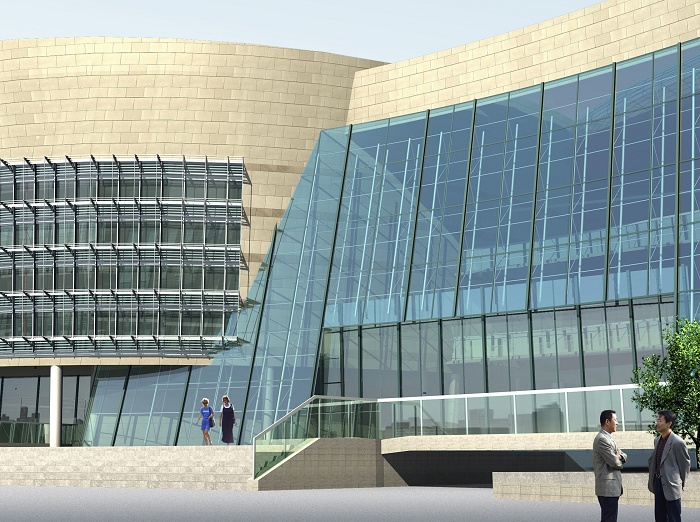 總體設計考慮用地位于丁字路口,呈三角形,館前要創造一定深度感的室外圍合空間,建筑物的體型要有利于創造這種空間,故采用了一字形的平面并作適當的建筑處理;建筑與北面聶耳文化廣場軸線中的聶耳雕像形成對景。