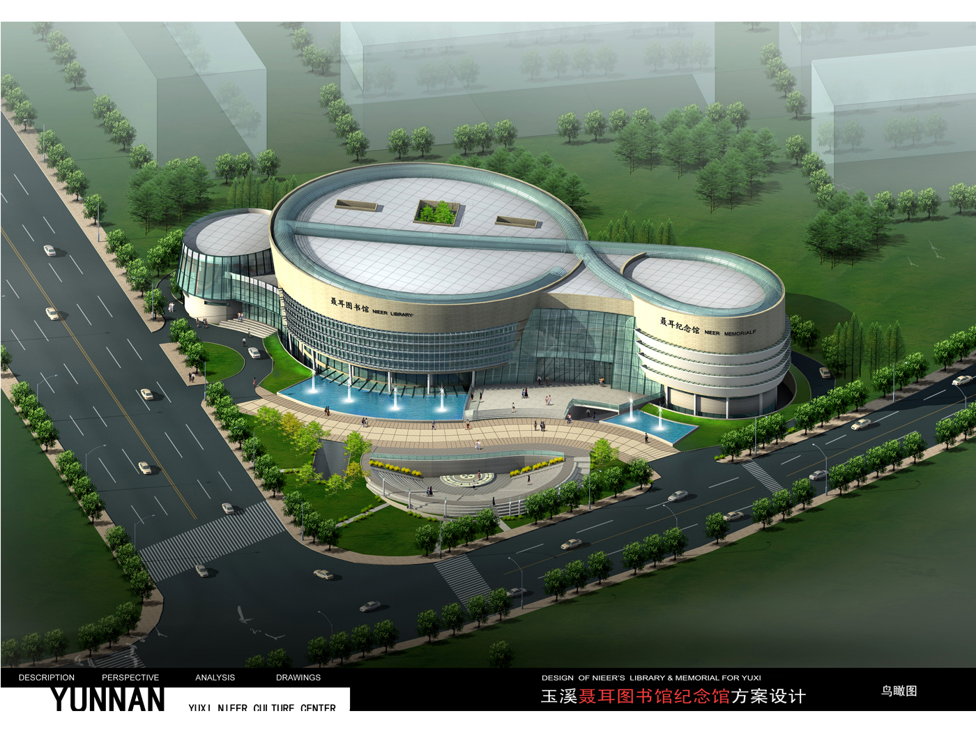 該工程包括兩項內容,即聶耳圖書館、聶耳紀念館。建設基地位于玉溪九大項目之一的玉湖之畔,北臨環湖路,東臨棋陽路,呈三角形,基地大小為20畝。 二館東臨全民健身中心,北面玉湖景區和聶耳文化廣場,朝向、景觀均佳。