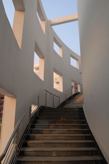 圖書館平面類似半圓形,弧形部分臨湖,直線部分面對教學樓和行政樓,為三層高建筑,主入口靠近教學樓,設于一層。平臺下局部設計為書庫和閱覽室。行政樓結合衛生所設計,共三層。其中一層為衛生所,二、三層為行政辦公部分。行政辦公樓平面形式類似直角等邊三角形,等斜邊部分面對教學樓和圖書館,中部設計成弧形。食堂位于生活區中心,一期建設時為二層,二期建設時對食堂進行了改擴建,改建后局部為三層,總建筑面積由6126平方米增加至14733平方米。生活輔助區由學生宿舍(其中一部分可考慮為教工宿舍),一個綜合性食堂,以及浴室、鍋爐房組成,一期四棟宿舍呈折線型平面,二期擴建時在食堂北側加建八棟學生宿舍。大、形成了更多語義。