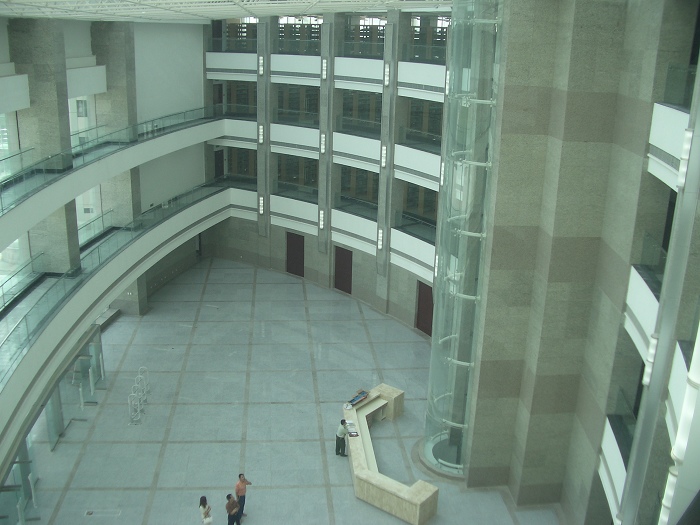 該館設計采用開放建筑的現代化圖書館設計理念與策略。”以不變應萬變”,提供像“超市”一樣的靈活的大空間,以創造建筑空間具有最大的適應性和靈活性。采用半園形的平面空間布局,內部空間開敞連貫;服務空間(樓梯、電梯、廁所等)集中布置在大空間之外;門廳上空設有四層共亨空間;半園形主體建筑共10層,自第五層開始采取逐層退后方式,使其上每層都有屋頂花園;建筑內部空間開敞、連貫、適應現代圖書館要求;功能分區合理,朝向、采光、通風良好;交通面積小,有效使用面積大;建筑體量較大,與其所處位置相稱,建筑造型也表現了“礪劍”文化之寓意;建筑物東西長度117.6米,距東、西兩面的道路稍近(3.0米)。