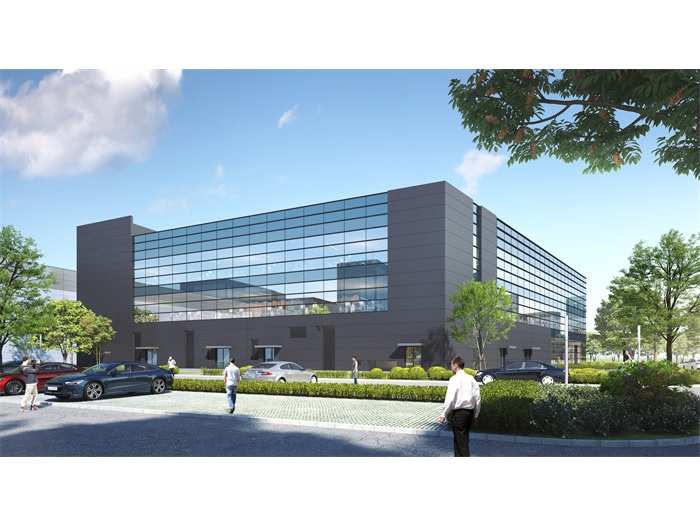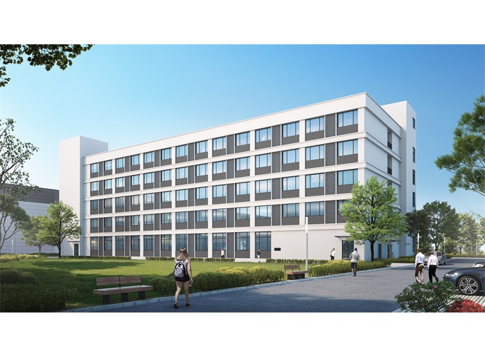 建筑立面設(shè)計簡潔大方、虛實對比,追求現(xiàn)代工業(yè)建筑的體量感,廠房墻面為橫鋪金屬巖棉板,以更好地體現(xiàn)現(xiàn)代化工業(yè)建筑的特征。綜合樓采用鋁板及玻璃幕墻,立面設(shè)計同時兼顧平面功能的要求,又可使整個基地內(nèi)的建筑物具有互聯(lián)的協(xié)調(diào)效果。